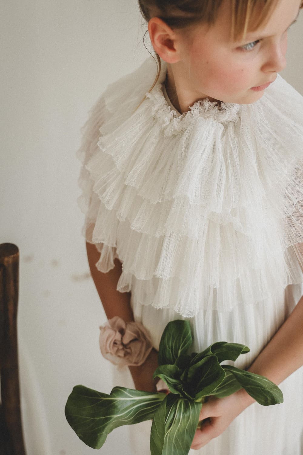 Colerette réalisée à la main, en tulle plissé ultra fin et très doux. Adaptable gràce à son montage sur ruban élastique, elle assure une mise en place pratique et parfaite. Elle est également utilisée pour se porter comme une petite cape.